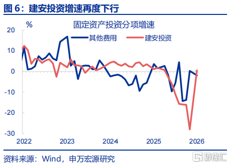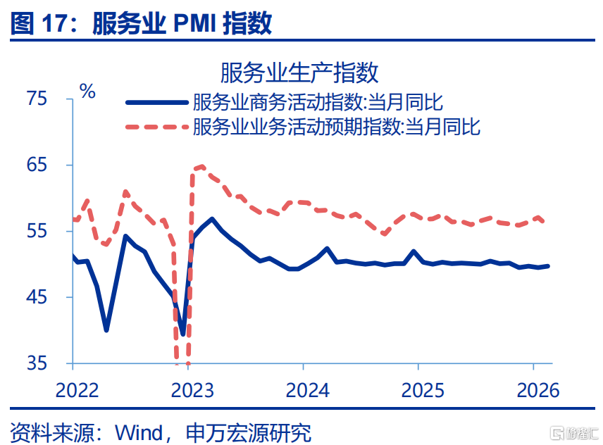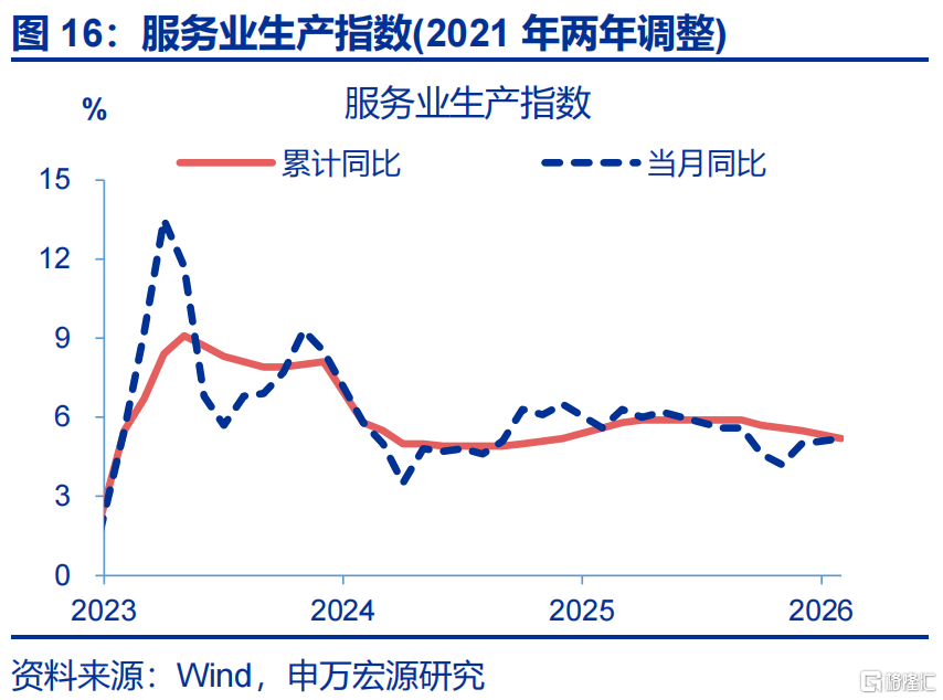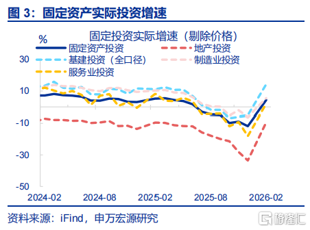 生产:工业生产、服务业生产均有回升。1-2月,工业增加值累计同比较12月上行1.1个百分点至6.3%;服务业生产指数累计同比较2025年12月上行0.2个百分点至5.2%。
