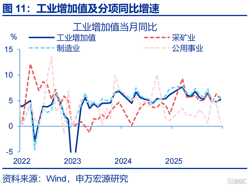 生产:工业生产、服务业生产均有回升。1-2月,工业增加值累计同比较12月上行1.1个百分点至6.3%。其中公用事业生产增速涨幅较大,累计同比回升3.9个百分点至4.7%,制造业、采矿业生产增速也有较大上行,累计同比分别回升0.9、0.7个百分点至6.6%、6.1%。此外,服务业生产也有回升,1-2月服务业生产指数累计同比较2025年12月上行0.2个百分点至5.2%。