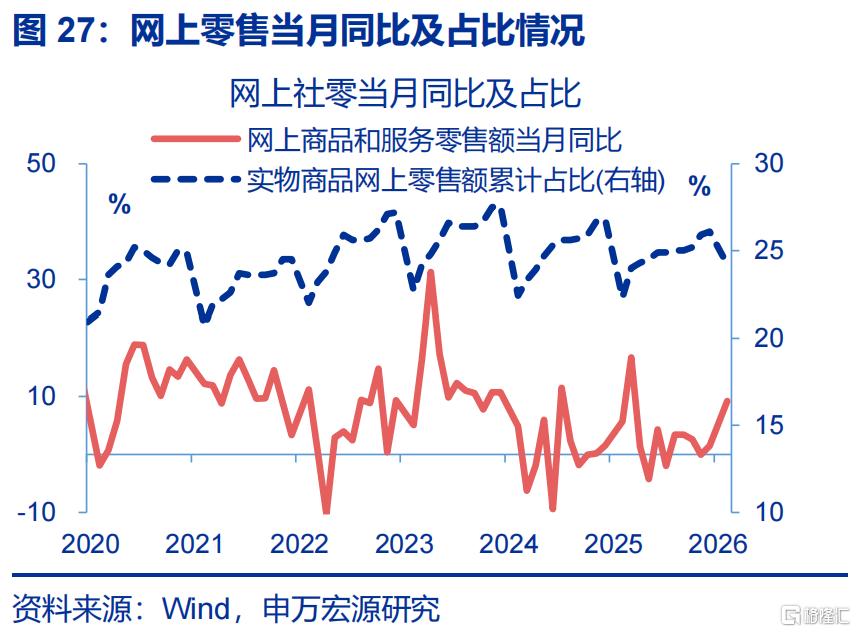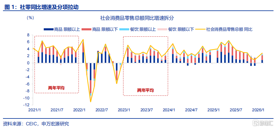 消费:社零增速回升较大,结构上餐饮、商品零售均有明显上行。1-2月,社零累计同比较2025年12月当月同比上行1.9个百分点至2.8%。餐饮收入上行2.6个百分点。