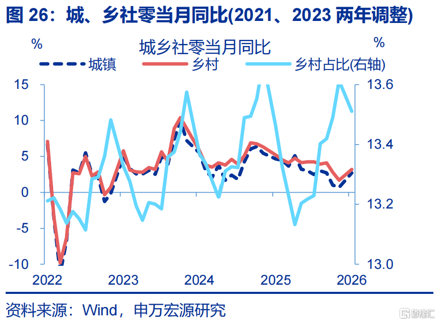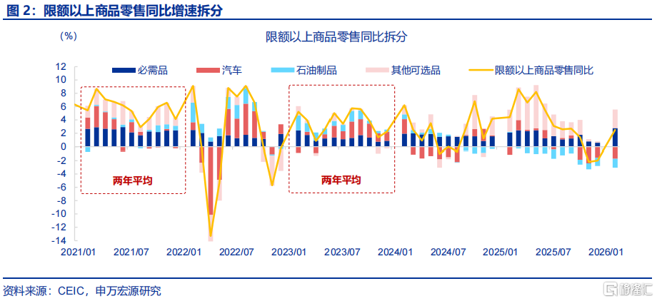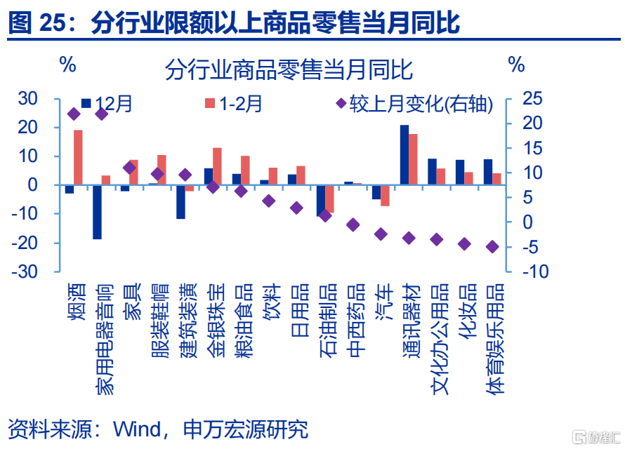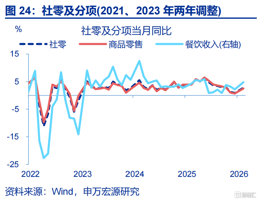 消费:社零增速回升较大,结构上餐饮、商品零售均有较大上行。1-2月,社零累计同比较2025年12月当月同比上行1.9个百分点至2.8%。其中,商品零售累计同比较2025年12月回升1.8个百分点至2.5%,餐饮收入累计同比较上月上行2.6个百分点至4.8%。分品类看,家电、家具等品类涨幅较大,累计同比分别上行22、11个百分点至3.3%、8.8%。