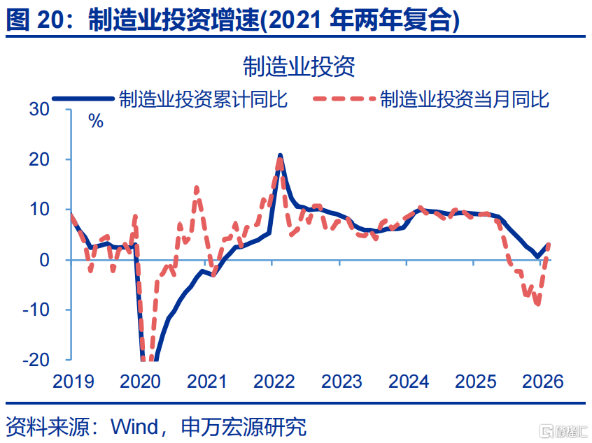 制造业投资明显回升,运输设备、通用设备等行业投资涨幅较大。1-2月,制造业投资累计同比较2025年12月回升12.7个百分点至3.1%。分行业看,金属制品、运输设备、通用设备等行业投资增速涨幅较大,累计同比分别较2025年12月上行41.1、40.7、31.8个百分点至7.4%、31.1%、-0.5%。