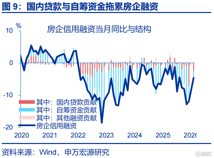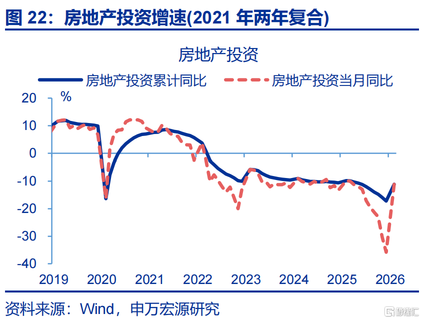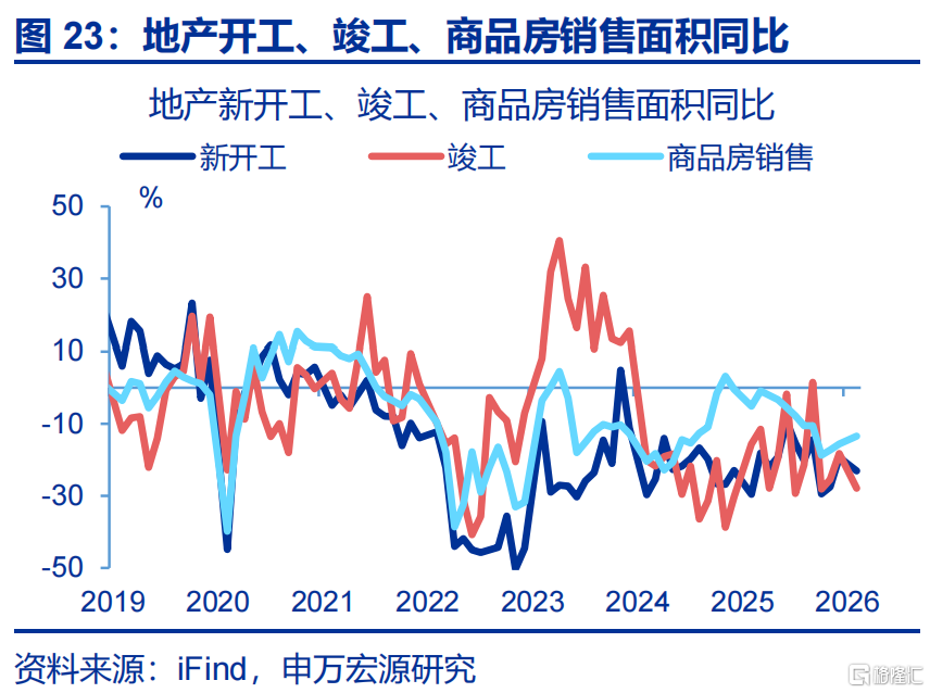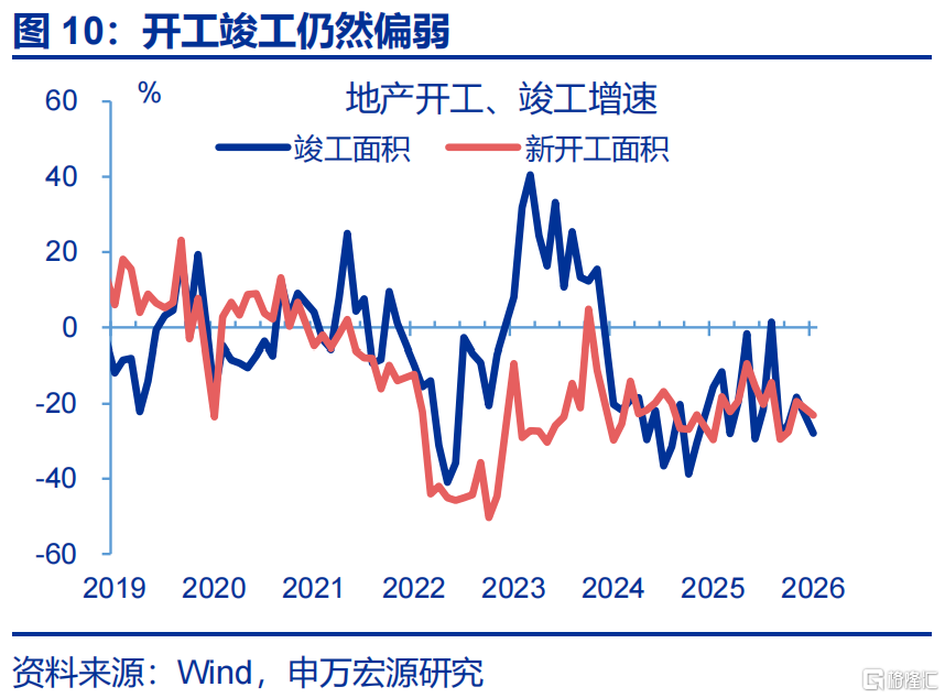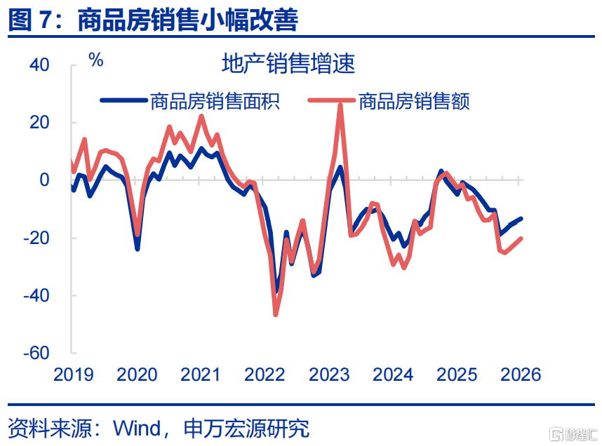 地产投资改善较大,商品房销售面积小幅回升。1-2月,房地产开发投资累计同比较2025年12月回升24.7个百分点至-11.1%。分不同阶段看,新开工、竣工持续磨底,累计同比分别较前月回落3.7、9.6个百分点至-23.1%、-27.9%,商品房销售面积有所改善,累计同比较2025年12月回升2.1个百分点至-13.5%。
