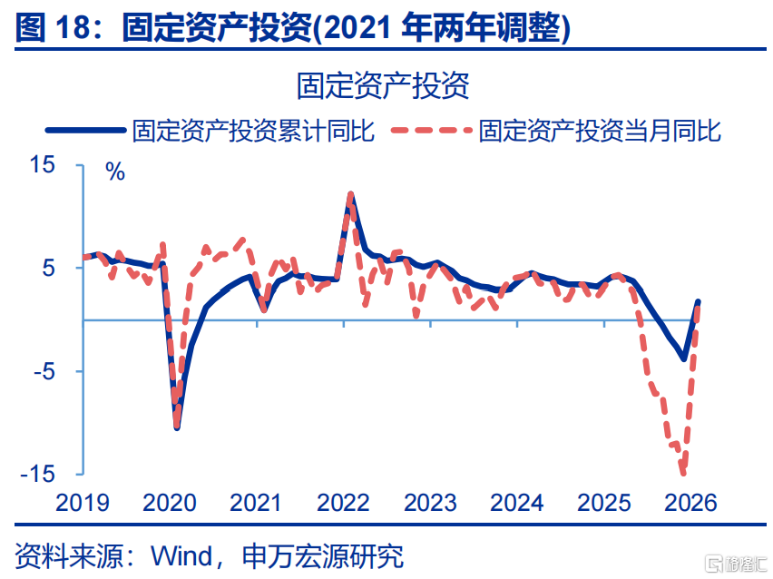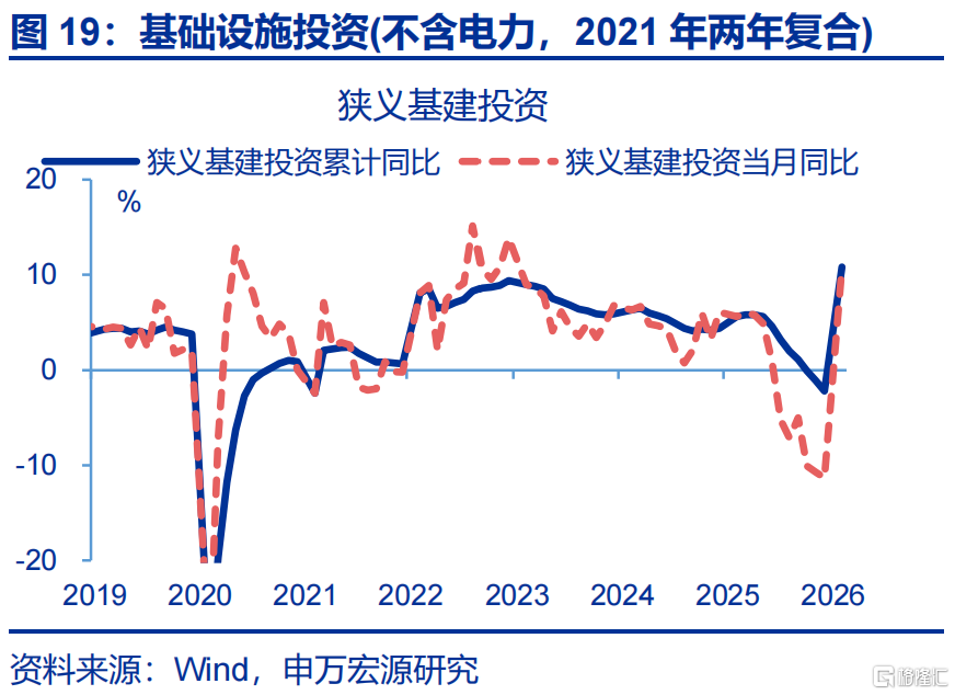 投资:固定资产投资大幅回弹,其中狭义基建投资涨幅较大。1-2月,固定资产投资累计同比回升较2025年12月上行16.9个百分点至1.8%;其中,狭义基建投资累计同比上行22.2个百分点至10.8%。