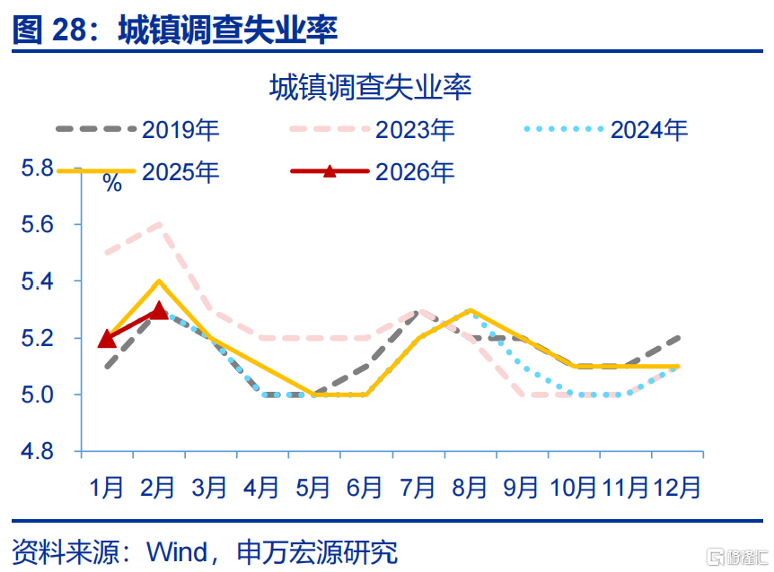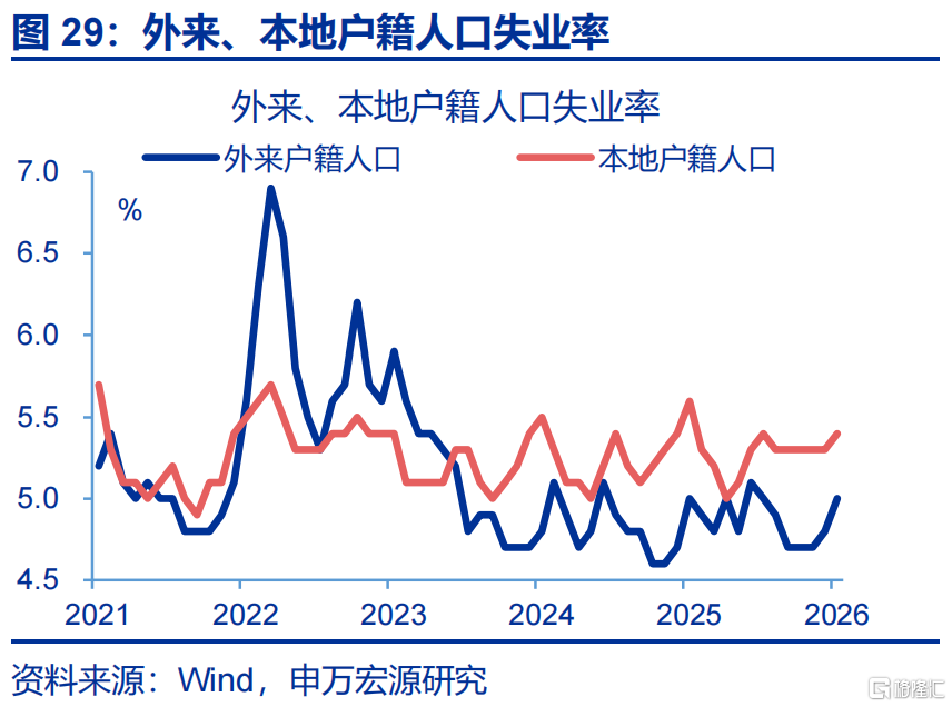 就业:城镇调查失业率小幅回升。1-2月,城镇调查失业率平均5.3%、较2025年12月上行0.2个百分点。其中,外来户籍人口平均失业率较2025年12月上行0.2个百分点,本地户籍人口失业率基本持平。