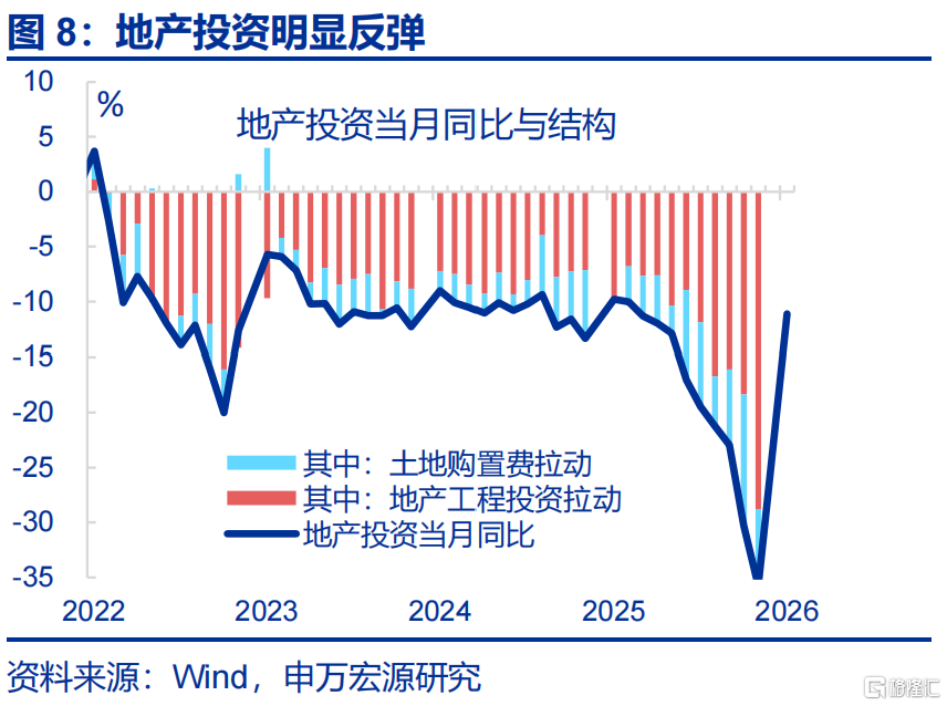 投资:固定资产投资大幅回弹,狭义基建、制造业、地产投资均有改善。1-2月,固定资产投资累计同比回升较2025年12月上行16.9个百分点至1.8%。狭义基建、制造业、地产投资分别较2025年12月上行22.2、12.7、24.7个百分点至10.8%、3.1%、-11.1%。