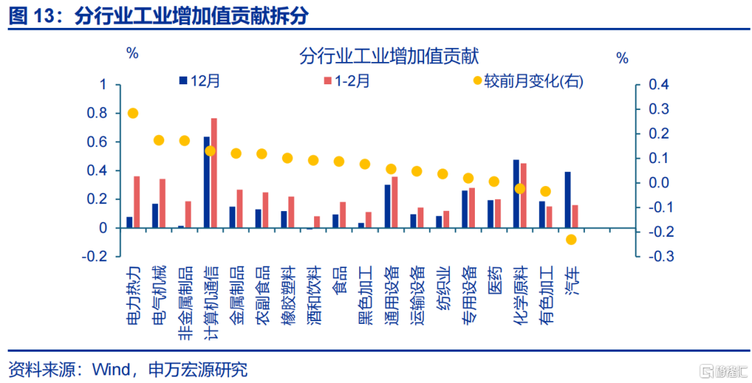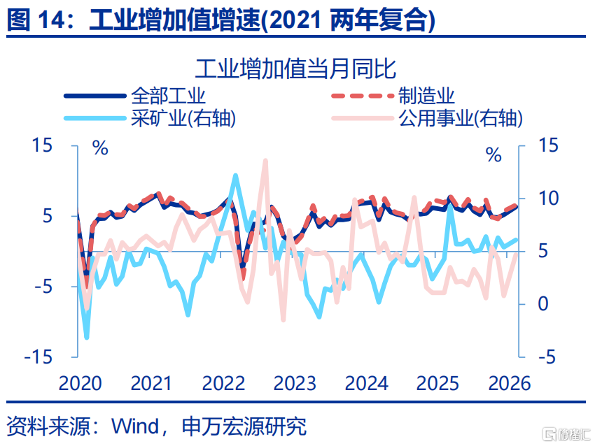 生产:1-2月工业增加值增速回升较大,反映“春节错位”与“需求改善”的共同影响。1-2月工业增加值累计同比6.3%、较2025年12月回升1.1个百分点;春节影响存在“节前赶工-节中停工-节后复工”三个阶段,测算“春节错位”推升1-2月工业增加值增速0.7-0.8个百分点。结构上,生产反弹幅度较大的是受“春节错位”影响较明显的劳动密集型行业,譬如食品制造业、酒饮料茶、农副食品等行业生产累计同比分别较2025年12月上行5.1、4.8、2.9个百分点至10.6%、4.3%、6.1%,也反映商品消费改善的影响;此外,运输设备、电气机械、计算机通信等行业生产回升幅度也较大,累计同比分别上行4.5、4.4、2.4个百分点至13.7%、8.7%、14.2%,或源于出口走强的拉动;非金属矿物、橡胶塑料生产改善,或与投资修复有关。