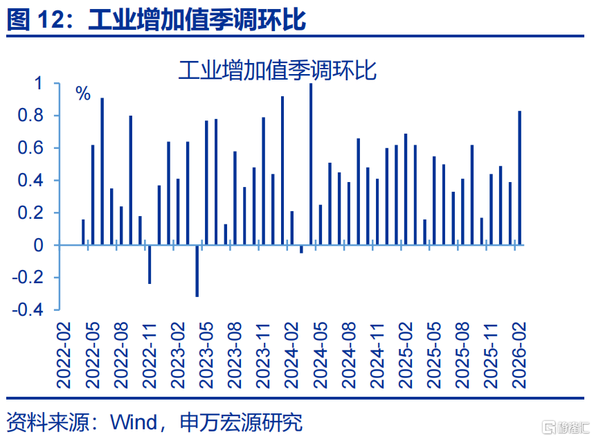 生产:1-2月工业增加值增速回升较大,反映“春节错位”与“需求改善”的共同影响。1-2月工业增加值累计同比6.3%、较2025年12月回升1.1个百分点,测算“春节错位”推升1-2月工业增加值增速0.7-0.8个百分点,结构上,生产反弹幅度较大的是受“春节错位”影响较明显的劳动密集型行业,也同时受商品消费改善影响;电气机械、非金属矿物等部分中间品与资本品生产也明显改善,或源于出口走强与投资修复的拉动。